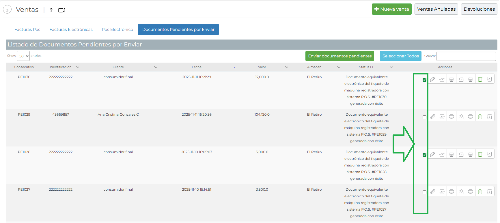 4.1- Si no se necesita reenviar todas, seleccionar facturas a enviar de manera individual desde el check al costado derecho: