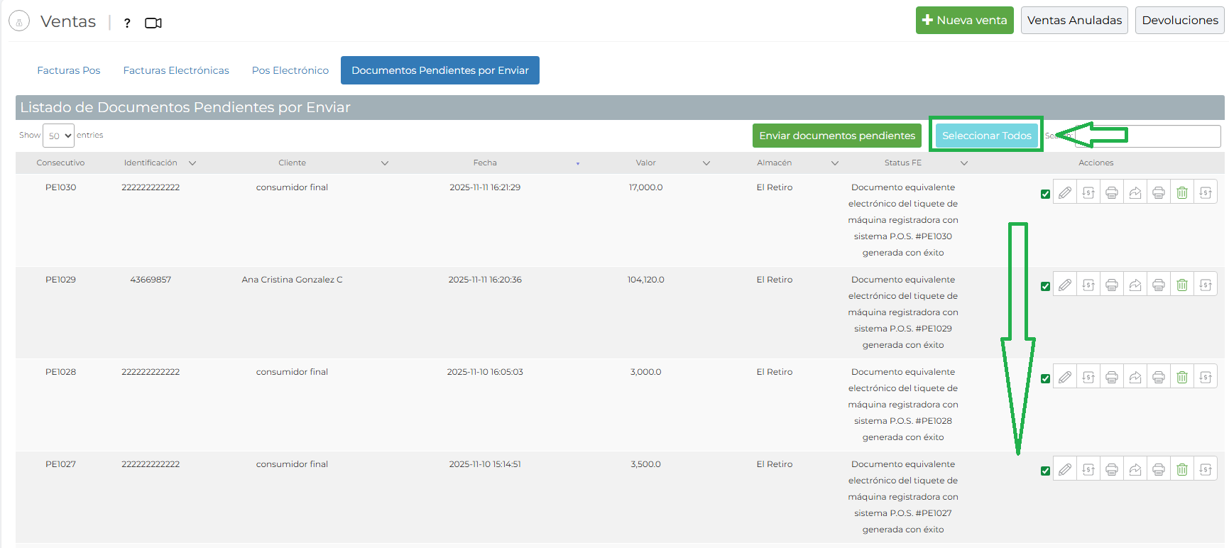 4- Clic en Seleccionar Todas si se necesita enviar todo el bloque de cada página de facturas: