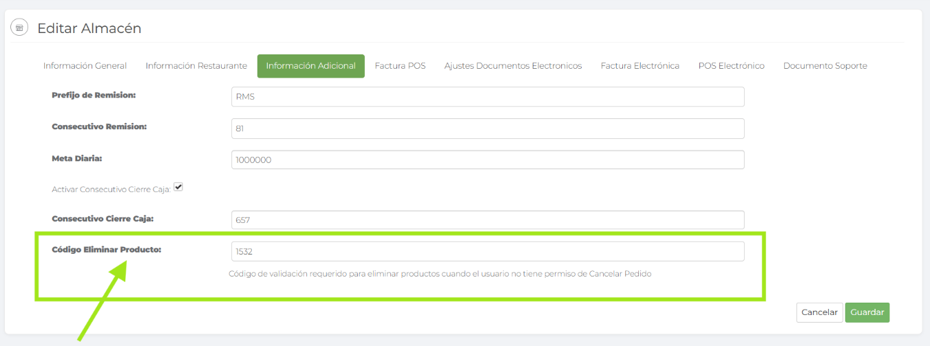 Para esta función es necesario generar un código en configuración de almacenes, el cual, solo podrá visualizar el usuario administrador y cada vez que requiera anular un producto en caja, solicitará el código.